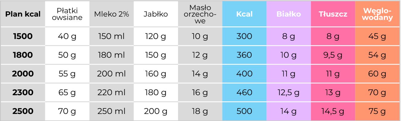 Składniki bazowe: (~300 kcal / plan 1500 kcal). Potrzebujesz bardziej sycącej porcji? Sprawdź tabelę, wybierz wariant kaloryczny i dostosuj proporcje w kilka sekund. Owsianka zawsze smakuje świetnie – i pasuje każdemu!
