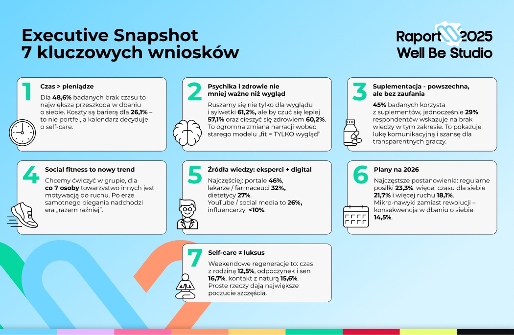 W najnowszym raporcie Well Be Studio “Self-care 2025 – Jak Polacy dbają o zdrowie, wygląd i samopoczucie” przedstawiamy dane, liczby i insighty, które ilustrują prawdziwe podejście Polaków do self-care — gdzie napotykają bariery i czego naprawdę oczekują od marek.